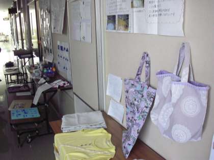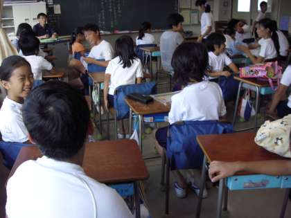5年生の教室では、朝の会が始める前の友達と仲良くおしゃべりタイムの様子です。男女ともに仲がいいです。廊下には、夏休みの自由研究の力作が展示されていました。