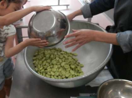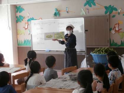 今日の給食では、ソラマメとサヤエンドウが出て、興味を持って食べていました。