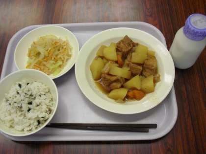 今日の献立は、わかめご飯、牛、ジャガイモのうま煮、ひとしおやさいです。
