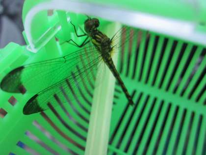 「アキアカネかな?」「赤くないからシオカラトンボの雌じゃないの?」「図鑑以外で、こんなに近くで見たのはじめてだ!」など子どもたちは嬉しそうに観察していました。