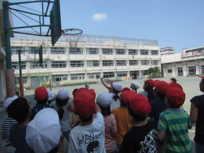 観察の後はアゲハと同様、みんなでお見送りです。「がんばってね〜!」と送り出したのですが、すぐにバスケットゴールにとまって一休み。まるで子どもたちのことを見守ってくれているようでした。
