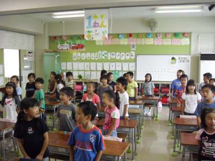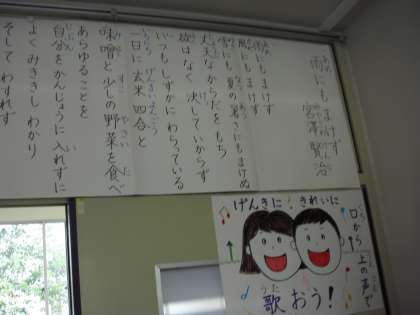 1年生の教室では、朝の会の前に“教科:日本語”で学習した“宮沢賢治の雨にもマケズ”の暗唱を全員でしてくれました。ほとんどの子どもは、覚えていて・・・声もみんな揃っていて、しかも正確に発表出来ました。たいへん立派です。