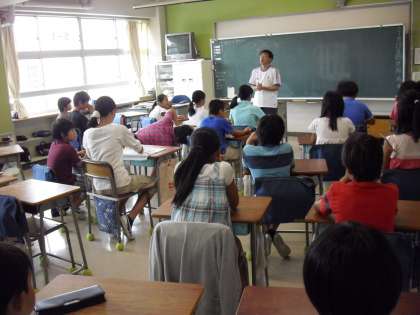 5年生の教室では、朝の会の先生の話の画面です。高学年として活躍中の5年生!