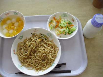 今日の献立は、塩焼そば、牛乳、そくせき漬け、フルーツポンチです。