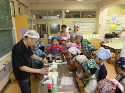 学校運営委員会の委員長をしてくださっている、毛利豆腐店の毛利さんから、美味しいお豆腐の作り方を教えていただきました。