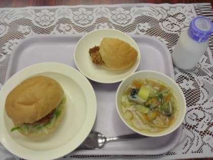 今日の献立は、チキンサンド、牛乳、ベーコンと野菜のスープです。今日もアレルギー対応食を調理員さんが作りました。