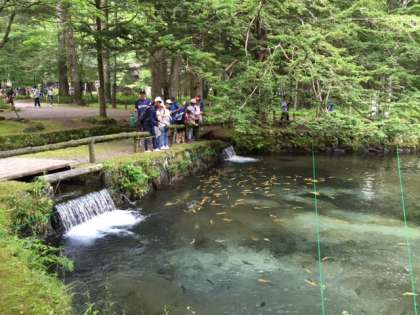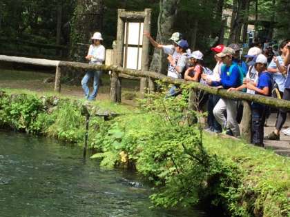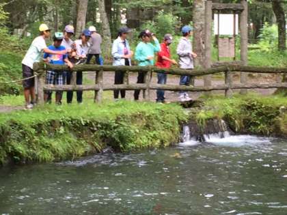 さかなと森の観察園では、一人ずつ魚の餌をカップにもらって、広い園内の中で思い思いの魚に餌をあげました。