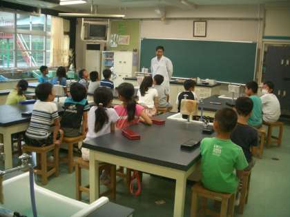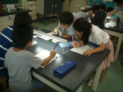 サマースクール4日目。今日は八幡中学校の大塚校長先生を講師としてお招きして、「八中 理科教室」を行いました。第1部は対象が3年生でした。ストローを使って静電気を起こす実験と顕微鏡でプレパラートにある葉脈を観察しました。全ての経験が初めてだったこともあり、熱心に実験や観察をしていました。