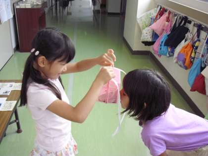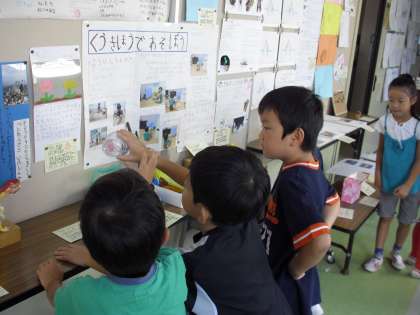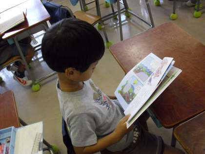 1年生は、朝の時間・・廊下の“夏休み作品を見あったり、青虫の入ったかごを見あったり”して、“朝読書”へ・・・。