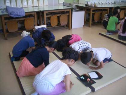 サマースクール5日目は茶道教室を行いました。講師は大田区の茶道キャラバンの皆さんです。第1部は3・4・5年生、第2部は1・2・6年生を対象として体験教室は始まりました。お辞儀なども細かい指導を受けるなど、どの児童も真剣なまなざしで体験授業に取り組みました。