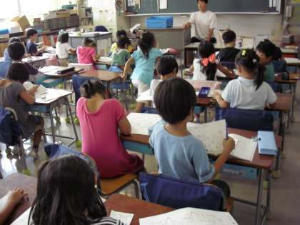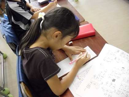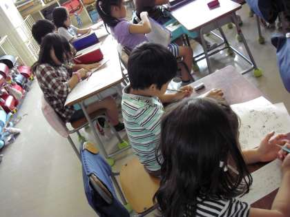 1年生は、おじさん・おばあさんとの“ふれあい給食”のことをいつも書いている5行作文用紙に書いていました。いつも可愛がってくれているので、たくさん感じたこと、思ったことがあることでしょう。