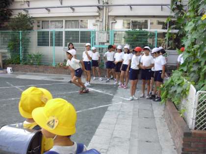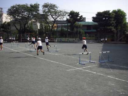 6年生の体育は、連合運動会の練習を兼ねて、50mハードル走、100m走、走り幅とび、走り高とびなどの練習をしていました。校庭がせまく、100mとれないのが、残念です。