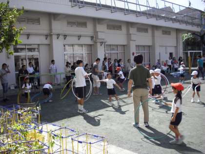 1年生は、“体育:輪をつかって”保護者の方も子どもと一緒にやってみました。