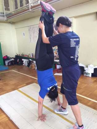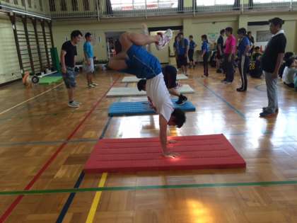 ・前転・後転・側方倒立回転・倒立の4種類のマット運動の技を、順番に実技指導を受けて体験しました。