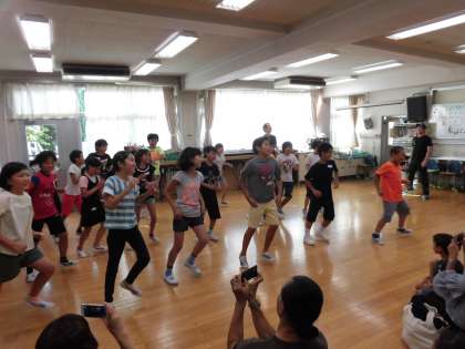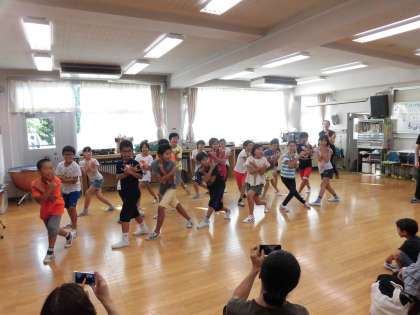 後半は、いよいよミュージック&ダンスづくり。ちびまるこちゃんのテーマ曲に合わせてみんなで歌詞や振り付けを考えながらダンスを創りました。最後には、参観にいらした保護者の皆様の前で、エバリーさんの演奏にのせて、川平さんや鈴木さんと一緒に子どもたちの笑顔あふれるダンスを披露することができました。