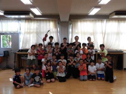 前半は、川平さんと相手を感じながらみんなが一体感をもてるようなゲームをしたり、音楽グループエバリーさんのバイオリンとピアノの演奏に合わせてリズムを叩いたりかけ声を入れたりして楽しみました。