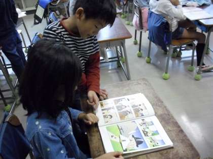 友達と仲良く本を読んでいる画面です。雨の日の朝の時間の使い方が上手です。
