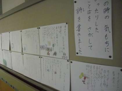 2年生・・・“朝の会”をはじめるところ・・・廊下には、取り組んできたことが掲示してあり、いつでも振り返ることができます。