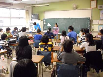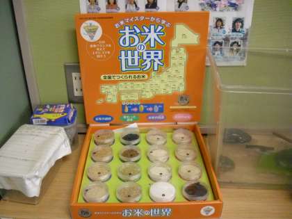 5年生・・・“朝の会:日直のスピーチ”・・・昨日、稲刈りをした5年生の教室の後ろには、“世界のお米”の例示が掲示してありました。