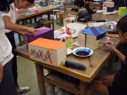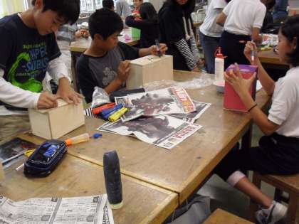 6年生の3・4時間目は、“図工”です。木箱の仕上げ作業をしていました。