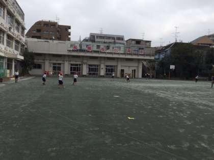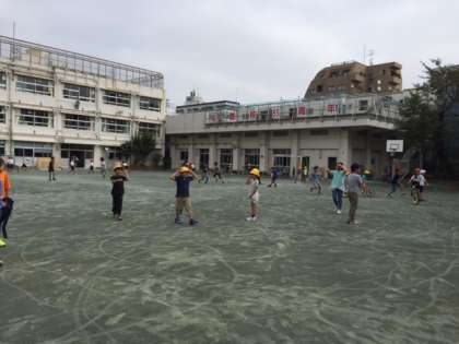 トイレの改修工事が終わりましたので、工事車両を入れていた校庭のフェンスが取り払われました。元のように広くなつた校庭では、子どもたちがのびのびと駆け回り楽しそうに遊んでいます。
