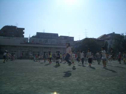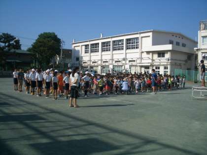 本校は火曜日の朝の時間に「長縄タイム」や体育朝会を行って体力の向上を目指しています。今回は体育朝会で短縄を使って縄跳びに取り組みました。前まわし跳びに始まり、最後は前振り跳び、横振り跳び等、難しい技にも挑戦しました。