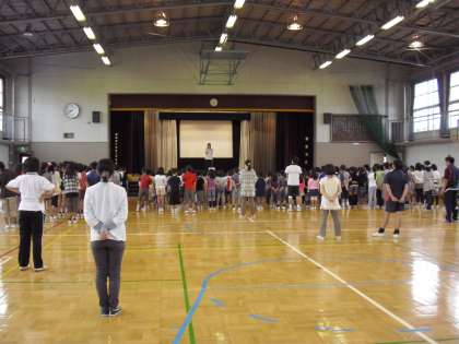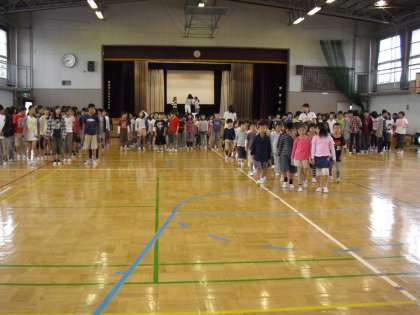 全校児童朝会で一週間がスタートしました。6年生2名が全校児童の前に立ち、寒くなっkるので、うがいや手洗いをして、風邪をひかないようにしましょうと話をしてから、校長先生にあいさつ・・・・校長先生は、今月の人格の完成を目指して“公共心”の話をしました。看護当番の先生から、今週の目標などを聞き・・全校児童朝会が終わります。