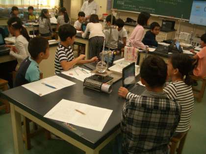 4年生は、水を熱したときの温度と様子の変化をタブレットで撮影し、その結果を学級で発表し合いました。タブレットを使うことの利点は、気になる部分を動画で振り返ることができ、発表の際も全体に伝えやすいことです。子どもたちのスムーズな操作に感心しました。初めて火を扱う実験でしたが、取り組み方も立派でした。次回も不思議を解決していきましょう。