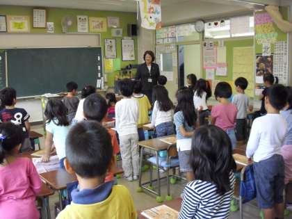 担任の先生の代わりに、副校長先生が来ています。朝の会が始まるところです。