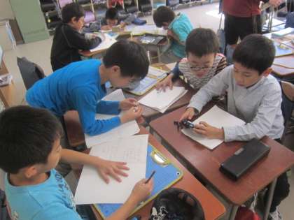 学校に戻って来た時の子ども達の表情はみんな生き生きとしていました。教室では、デジカメを見ながら班ごとに振り返りをしました。この後は、見学でわかった事をポスターにまとめる予定です。