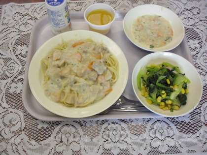 今日の献立は、スパゲティホワイトソースかけ、乳酸飲料、チンゲン菜とコーンのソティー、みかんゼリーです。エビアレルギー対応食(小皿のソース)を調理員さんが作りました。