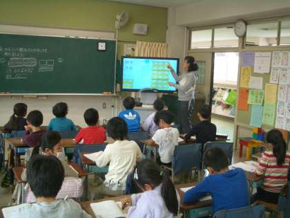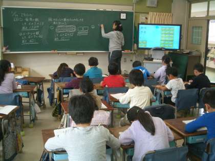 算数の授業で大型テレビと実物投影機を使って授業をしています。特に低学年の場合は言葉の指示より視覚的にしかも一定時間、文字や形としてに残るものの方がより的確に情報を理解することができます。