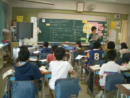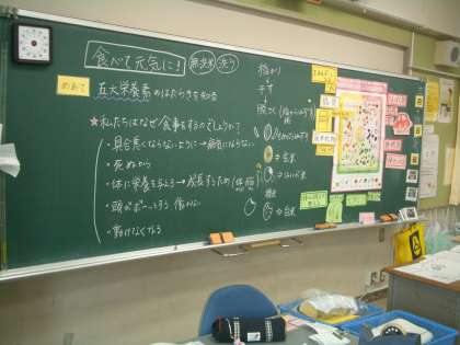 家庭科の授業です。本日は五大栄養素について学習しています。掲示物と文字の色を使い分けて栄養素ごとのはたらきを指導しています。文字を書く場所と掲示する場所を予め決めてあるので、子ども達にとってわかりやすくなるよう事前に準備されています。