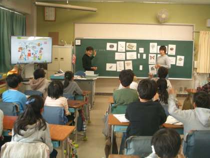 外国語活動の授業です。英語支援員と一緒に担任が授業を行っています。大型テレビと実物投影機を使って児童全員に見てほしいページを映しています。このように映し出すと少ない指示でもより正確に児童に教師の意図することが伝わります。