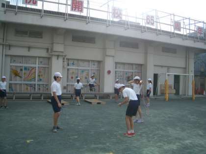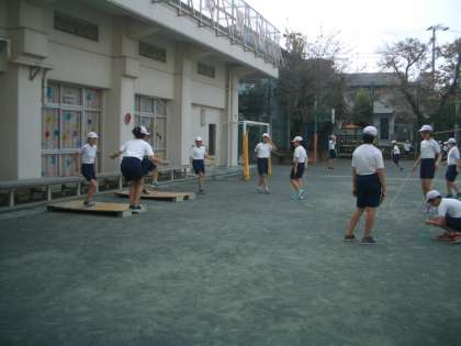 体育の授業で6年生が縄跳びの練習をしていました。これは昨年度、学校主事さんに作ってもらったものです。毎年、この時期になると校庭の一画に練習台が出されます。6年生もこの練習台を使って繰り返し二重跳びの練習をしていました。