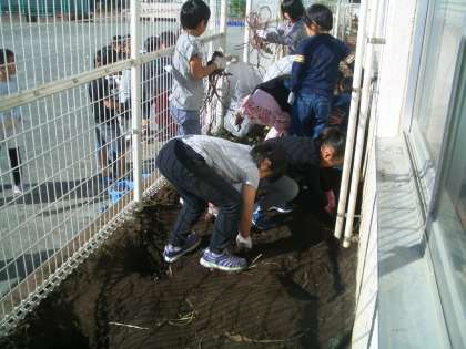 2年生は生活科の授業で育てたサツマイモを収穫しました。前の日に蔓は取ってあったので、すぐに学級園に入りサツマイモを探しました。学級園は少し狭いのですが、仲良く順番を守っていました。