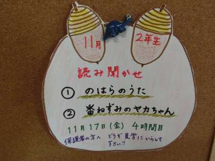 今日は月に1度のLアンL読み聞かせでした。「のはらうた」と「番ねずみのヤカちゃん」の読み聞かせでした。季節のどんぐりの手遊びに続いて、「のはらうた」のこねずみしゅんとどんぐりの詩を聞きました。