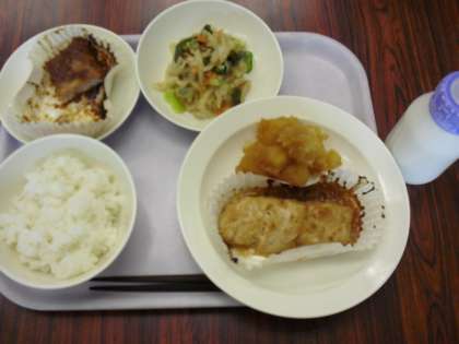 今日の献立は、ご飯、牛乳、魚の味噌マヨネーズやき、ジャガイモの甘辛煮です。