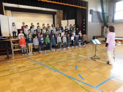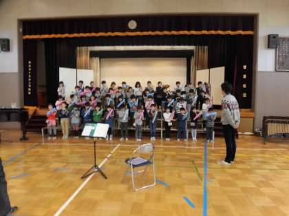 明日は、いよいよ2学期最後となる学校行事「開校65周年記念音楽発表会♪」があります。今年は、各学年で、開校65周年をお祝いしたテーマにそった音楽を選びました。