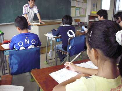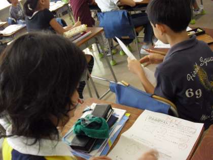 5年生は、“算数科:少数指導”・・・面積の学習・・・練習問題のプリントの確認や先生の話を聞いている様子です。