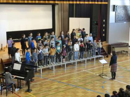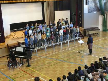 3年生が発表している様子です。テーマは「まつり」で合唱「大空のカーニバル」リコーダー「笛星人」を披露しました。