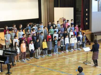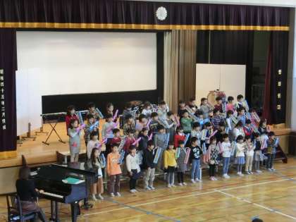1年生が発表している様子です。テーマは「ともだち」で斉唱「大切なともだち」、鍵盤ハーモニカで「きらきらぼし」を披露しました。