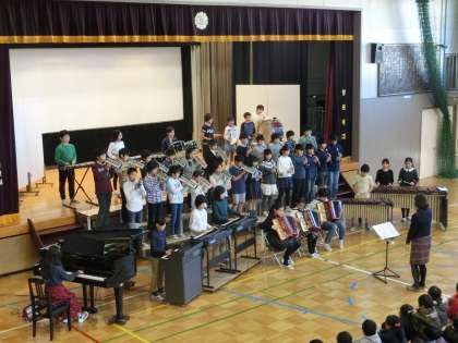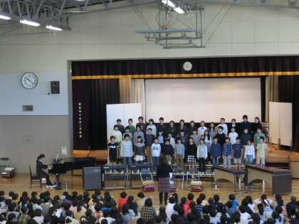 5年生が発表している様子です。テーマは「ぼうけん」で合唱「船で行こう!」合奏「彼こそが海賊」を披露しました。
