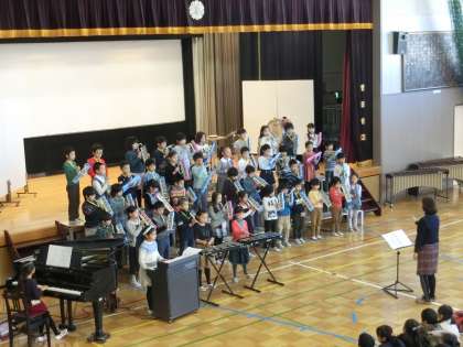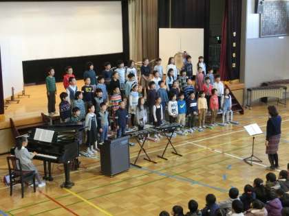 2年生が発表している様子です。テーマは「げんき」で斉唱「おはようのエール」と鍵盤ハーモニカで「山のポルカ」を披露しました。