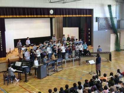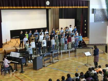 4年生が発表している様子です。テーマは「たからもの」で合唱「永遠のキャンバス」と合奏「茶色のこびん」を披露しました。