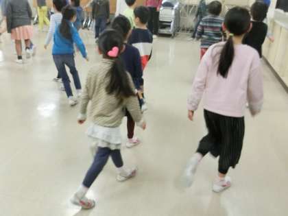 音に合わせて歩いたり、グループで合わせたりして、楽しみながら活動できました。