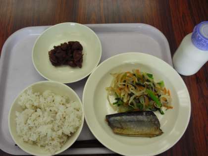 今日の献立は、ゴマ入りご飯、牛乳、さんまの塩焼、煮豆、おひたしです。