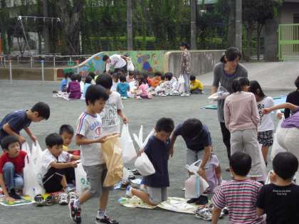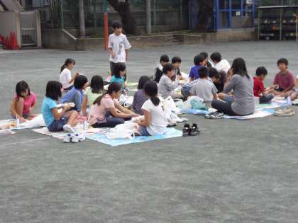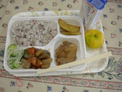 今日の給食の献立は、お弁当箱ーゆかりご飯、牛乳、くだもの、鶏肉の照り焼き、炒り煮、フライドポテトをいれて、校庭や屋上などで、クラスのみんなで食べます。