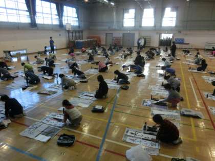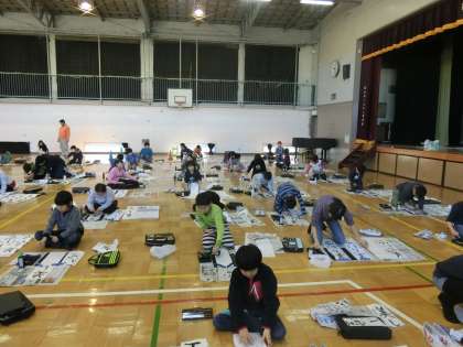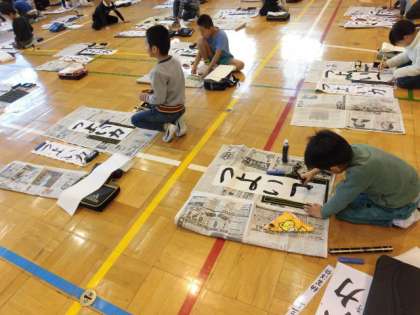朝のきりりとした空気が残る体育館で、3・4年合同で書き初め会を行いました。