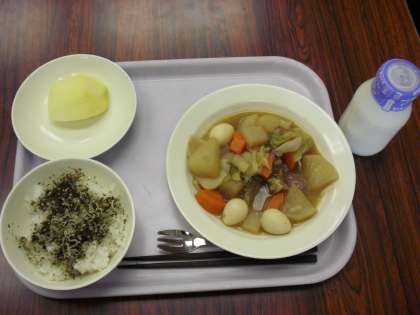 今日の献立は、ご飯、ふりかけ、牛乳、豚肉と大根のうま煮、くだものです。